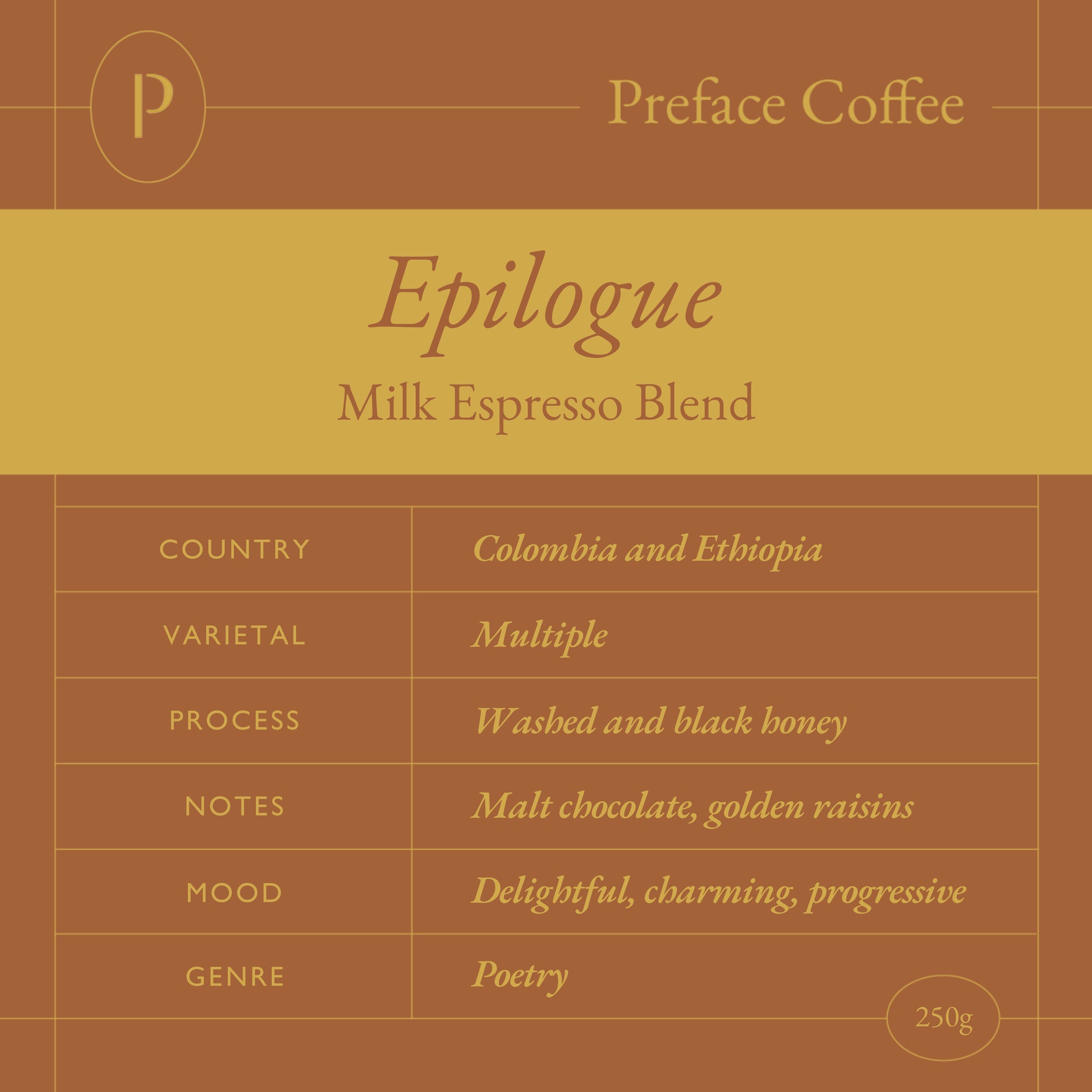 The Epilogue is crafted for those who savor milk-based espresso drinks with gentle complexity. Designed to shine through steamed milk, it offers a base of malt chocolate with a subtle lift of golden raisin sweetness, resulting in a cup that is both comforting and distinctive.